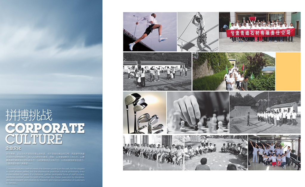 二十多年的歷程,公司從幾十平米的門店、幾個(gè)人員、幾萬元資金的石材經(jīng)銷開始,歷經(jīng)艱辛,團(tuán)結(jié)奮斗,本著說“石”話,辦“石”事,真真正正做朋友,實(shí)實(shí)在在做生意的一貫理念,以優(yōu)質(zhì)的產(chǎn)品和完善的服務(wù),打造出“青峰石材”這一享譽(yù)西北市場、備受客戶青睞的品牌形象。 公司始終以現(xiàn)代化企業(yè)為管理目標(biāo)和追求,建立健全了完整的管理體系。以制度為基礎(chǔ),以標(biāo)準(zhǔn)化為要求,以人性化為工作方法,全員制定落實(shí)了責(zé)任、權(quán)力、利益、義務(wù)的行為準(zhǔn)則,形成了現(xiàn)代化企業(yè)管理的成熟模式,為公司的長足發(fā)展夯實(shí)了基礎(chǔ)。 以品牌化建設(shè)立足市場,立信于市場為信念,公司全員本著為客戶創(chuàng)造價(jià)值,為客戶提供最滿意的產(chǎn)品和服務(wù),必須先錘煉自身的人品?!皼]有好的人品,生產(chǎn)不出好的產(chǎn)品”這一法則始終貫穿在青峰人的工作當(dāng)中。在打造自身品質(zhì)的同時(shí),每年動(dòng)用近百萬元,通過國際、國內(nèi)展覽會(huì)、互聯(lián)網(wǎng)、電視、報(bào)業(yè)、市政廣告等多種渠道進(jìn)行廣告宣傳,使“青峰石材”這一品牌立足甘肅,走向全國,走向世界。 公司以人為本,以人才為中心,以團(tuán)隊(duì)管理為核心的管理理念,公司上下400多名員工有機(jī)地形成了以高管理素質(zhì)成員組建的管理團(tuán)隊(duì),以市場經(jīng)驗(yàn)豐富的成員組建的營銷團(tuán)隊(duì),以專業(yè)技術(shù)人員組成的生產(chǎn)研發(fā)團(tuán)隊(duì),打造成了現(xiàn)代企業(yè)管理機(jī)制,使得公司保持了長足的發(fā)展,培育了企業(yè)持續(xù)健康發(fā)展人才管理隊(duì)伍,為實(shí)現(xiàn)百年青峰這一宏偉大業(yè)邁出了堅(jiān)實(shí)的一步。近年來公司連年獲得了省市區(qū)政府授予的“先進(jìn)企業(yè)”、“誠信企業(yè)”、“重合同、守信用”等多項(xiàng)榮譽(yù)稱號(hào)。2004年成為西北首家石材企業(yè)通過ISO9001-2000質(zhì)量管理體系認(rèn)證的企業(yè),先后被多家銀行授予4A或5A級(jí)信譽(yù)企業(yè)。
